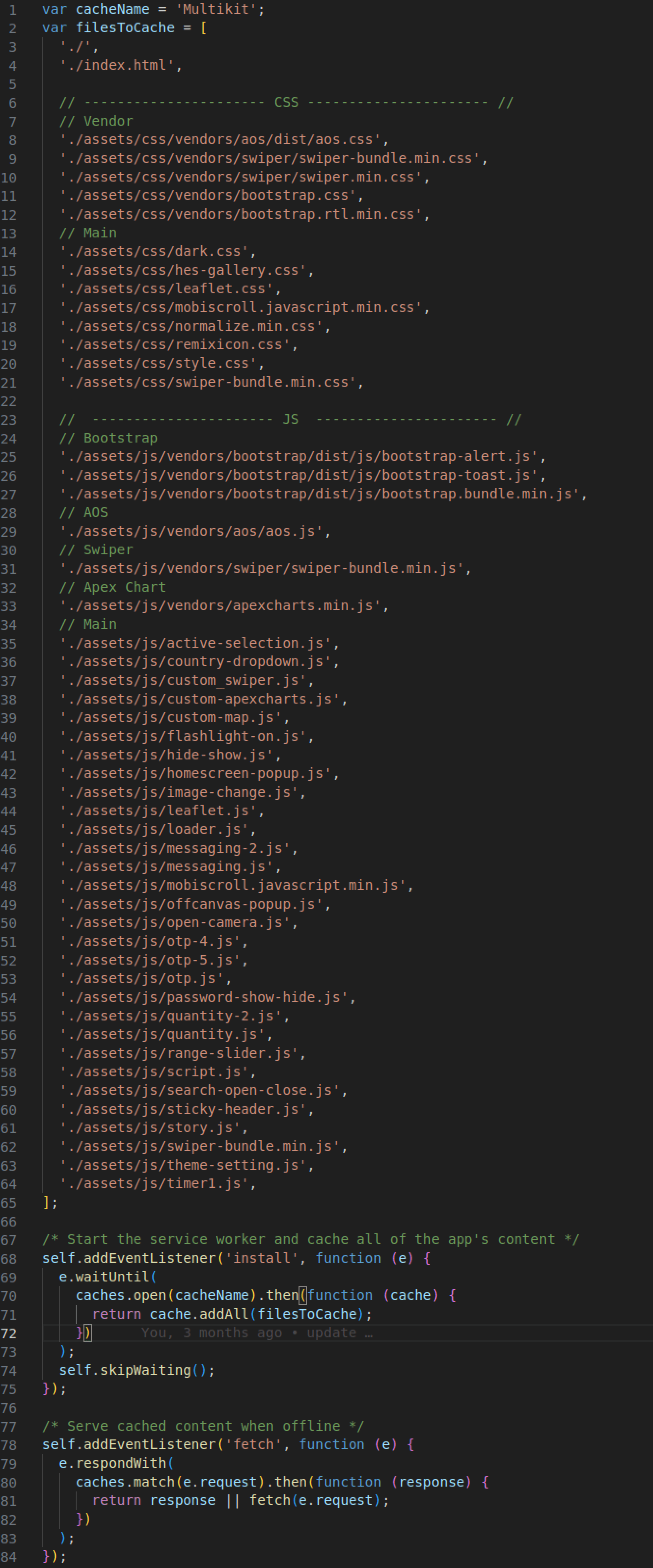 A service worker is a script that allows intercepting and control of how a web browser handles its network requests and asset caching. Here you can attached the css and js files.